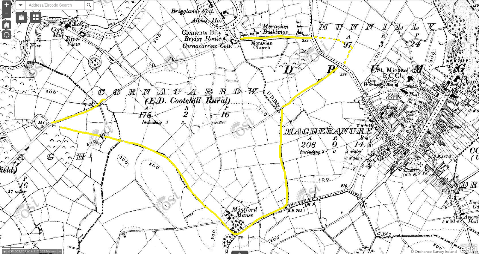 Neste caso Muinchille do condado de An Cabhán (Cavan) anglizada como Cootehill. Onde é possível observarmos a mesma forma de cousso de caça, captura.
